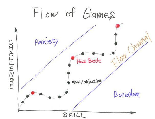 またゲーム(学習)の流れの中での難易度バランスを考えるのも重要で、チャレンジャブルなステージ/面(学習/課題)を与えすぎてもついてこられなかったり、経験値稼ぎのような状況を多くしても退屈な状況を生み出してしまいドロップアウトしてしまう。それらのバランスを流れの中でうまく与えることが、のめり込むためのポイントである。これらの要素はゲームだけでなく、eラーニングそして集合研修や仕事に対しても共通する概念であると感じた。