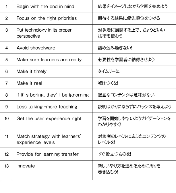 このセッションでは、ラーニングコンテンツを作成するためのポイントを紹介。下記の13のポイントが重要であると説いていた。スピーカーのRosenberg氏は、「Eラーニング戦略(日本訳版:ソフトバンククリエイティブ刊)」の著者である。盛況なセッションで200名が入る会場キャパシティを超え、立ち見が出るほどで、参加者から質問などが活発に行われていた。セッション終了後も個別に質問に並ぶ参加者が印象的であった。