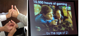 その後、会場の参加者たちに、人と人を連結して親指ゲームを行わせてPositive Emotionを実感させたり、「EVOKE」という現実社会の問題をテーマとしたオンラインゲーム(http://www.urgentevoke.com/ )が、世界の問題を解決することにつながることを示したりした。「EVOKEは現実の生活を改善することでゲームに参加することができ、かつゲームへの参加を通じて、実際の社会問題も解決されていくというようなしくみである。今までになかったゲームの新しい考え方であり、教育の分野においても非常に参考になるコンセプトだと感じた。
