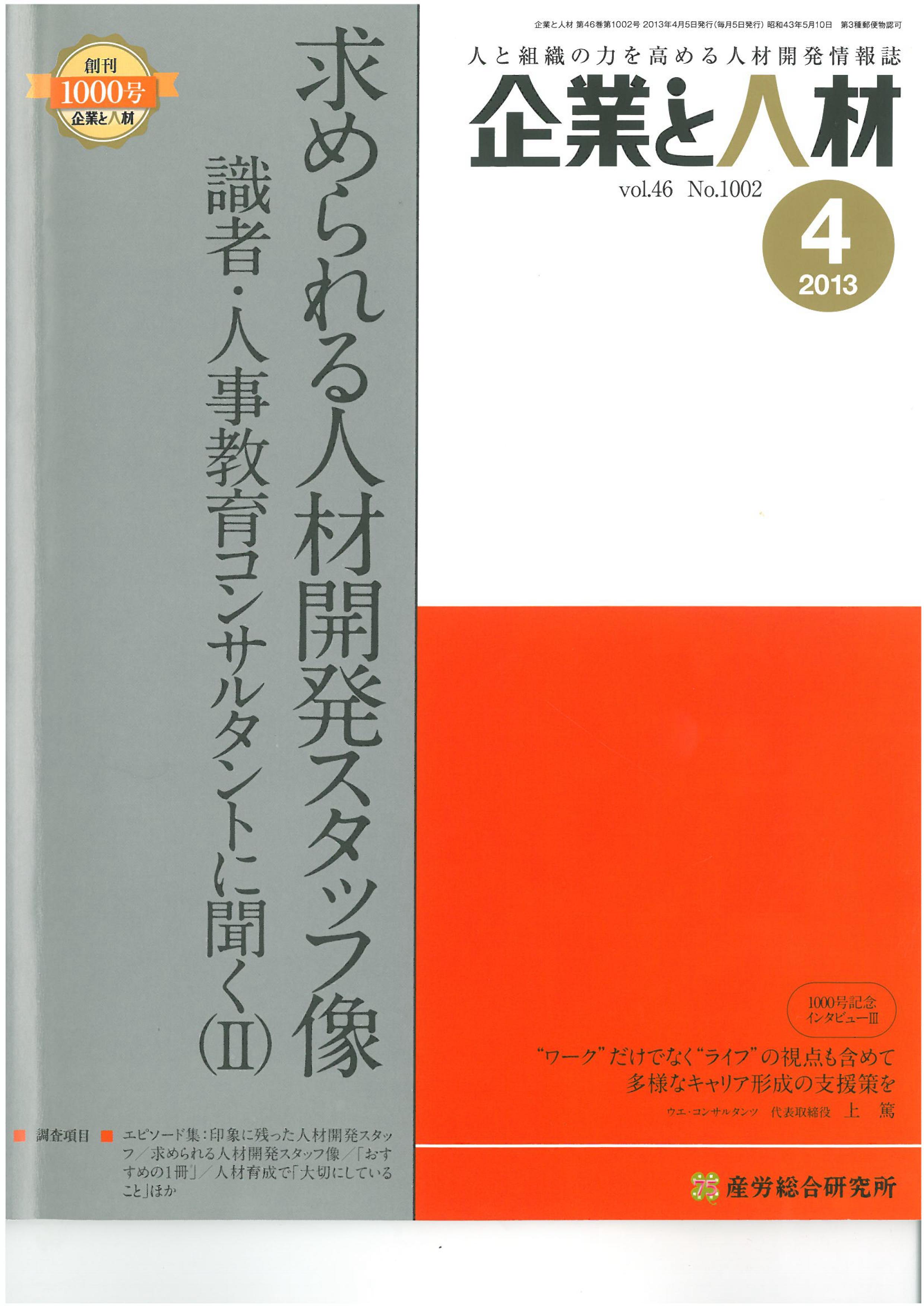 【企業と人材】2013年4月号 「求められる人材開発スタッフ像 ~識者・人事教育コンサルタントに聞く(Ⅱ)~」内にて、求められる人材開発スタッフ像について、弊社代表浦山昌志がコメントを寄稿しております。